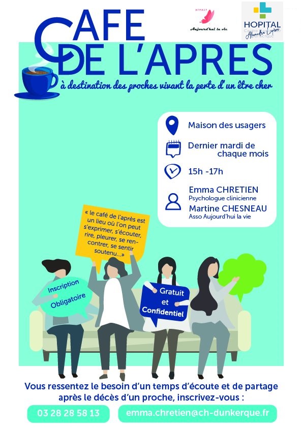 Nous vous proposons de participer gratuitement à notre Café de l’Après tous les derniers mardis de chaque mois de 15h00 à 17h00 à la Maison des Usagers de l’Hôpital Alexandra Lepève (Centre Hospitalier de Dunkerque). Séance animée avec bienveillance par l’une de nos bénévoles et une psychologue clinicienne.