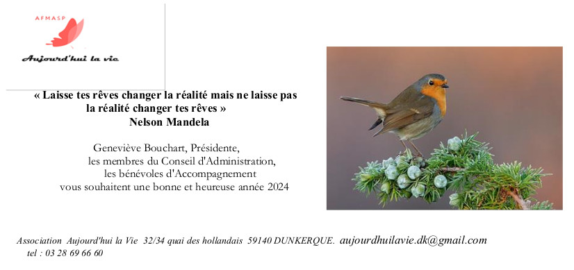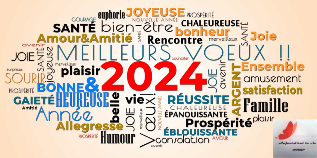 Notre Présidente, tous les membres du Bureau et du Conseil d’Administration, ainsi que toute notre équipe de bénévoles (Accompagnants et Administratifs) vous souhaitent une belle année 2024.