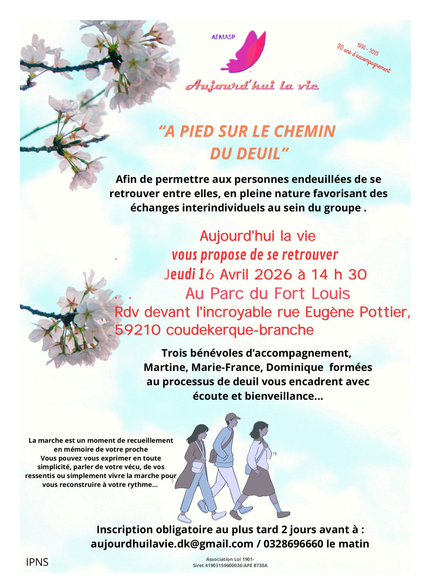L’association Aujourd’hui la vie propose de se retrouver le jeudi 16 avril à 14h30 devant le magasin L’Incroyable, rue Eugène Pottier, 59210 Coudekerque-Branche, pour une marche au Parc du Fort Louis.